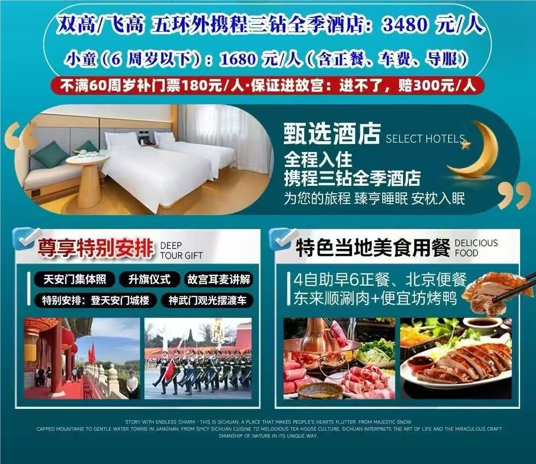 游覽景點:天安門廣場(游覽約1小時) 前往天安門廣場,傾聽祖國心臟的脈搏,目睹壯觀的“天安麗日”景觀,瞻仰毛主席遺容——【毛主席紀(jì)念堂】(每日限流如遇未預(yù)約到門票或者政策性閉館時,改觀外景),觀雄偉的【人民英雄紀(jì)念碑】,外觀【人民大會堂】,游覽景點:天安門城樓(游覽約1小時如未預(yù)約成功改為景山公園) 遙想新中國的建立、抗戰(zhàn)勝利80周年閱兵場景。 游覽景點:故宮博物院(放慢腳步,留足3小時), 故宮是中國明清兩代的皇家宮殿,舊稱紫禁城。這里曾居住過24個皇帝,是世界上現(xiàn)存規(guī)模最大、保存最為完整的木質(zhì)結(jié)構(gòu)古建筑之一。走近全新開放的《還珠格格》皇太后居住的慈寧宮、《甄嬛傳》熹妃娘娘居住的壽康宮,感受皇家萬千氣象。 游覽景點:天壇公園(含小門票)(游覽約1小時) 天壇是明清兩代皇帝祭祀天地之神和祈禱五谷豐收的地方。被認(rèn)為是現(xiàn)存的一組最精致,最美麗的古建筑群。天壇以嚴(yán)謹(jǐn)?shù)慕ㄖ季?、奇特的建筑?gòu)造和瑰麗的建筑裝飾著稱于世。 溫馨提示: 1、故宮每日限流3萬人,門票常年緊張,若您近期打算出游,請盡早下單,以免門票售罄無法參觀。 2、故宮門票提前7天晚上8點開售,我們將在第一時間為您預(yù)約購票,盡量搶票。 若實在無法搶到故宮門票,最 晚提前一天通知您:【全額退還故宮門票,免費贈送:景山公園,登高俯瞰故宮全貌】。如您介意,請報名時與接待人員說明清楚。行程游覽順序可能會根據(jù)故宮門票搶到的日期進(jìn)行調(diào)整,請您理解。 3、故宮游覽時間較長,本日午餐時間較晚,建議自備一些點心和零食充饑。 |